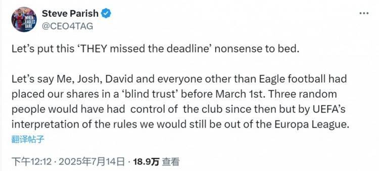 帕里什社媒驳斥“水晶宫错过改变股权最后期限”的说法,他写道:“让我们来终结‘他们错过了最后期限‘的无稽之谈。”